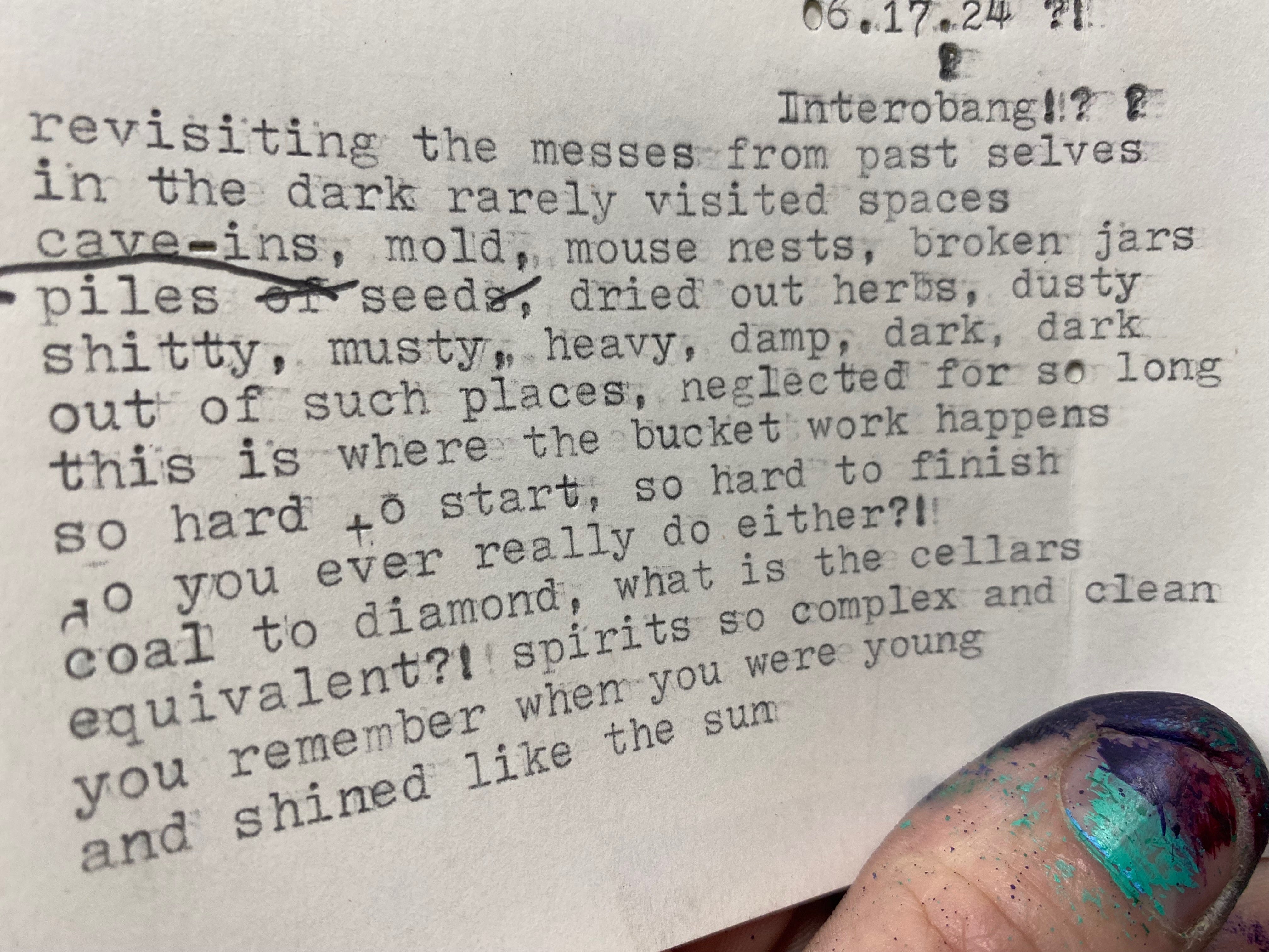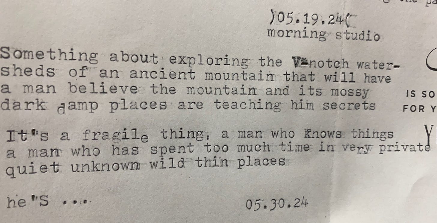I get out the typewriter and find some old pages, reluctant to share them here, but think it’s entertaining. In 2024 I was clearly attracted to and finding things in damp dark places, natural and from my own hand.